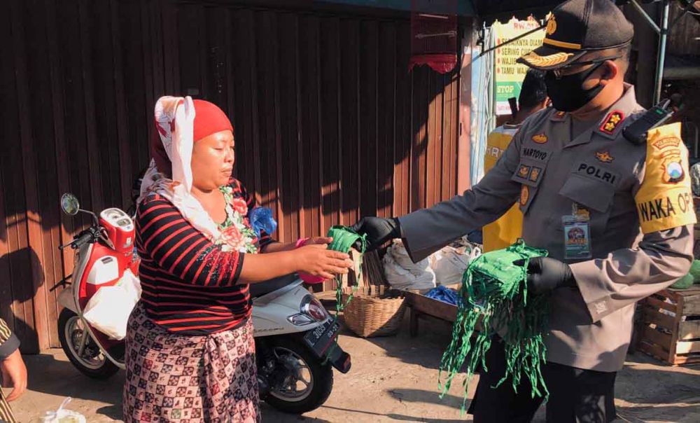 Waka Polrestabes Surabaya, AKBP Hartoyo saat membagikan masker menyesalkan kesadaran masyarakat dan pedagang Pasar Keputran tidak menerapkan protokol kesehatan.