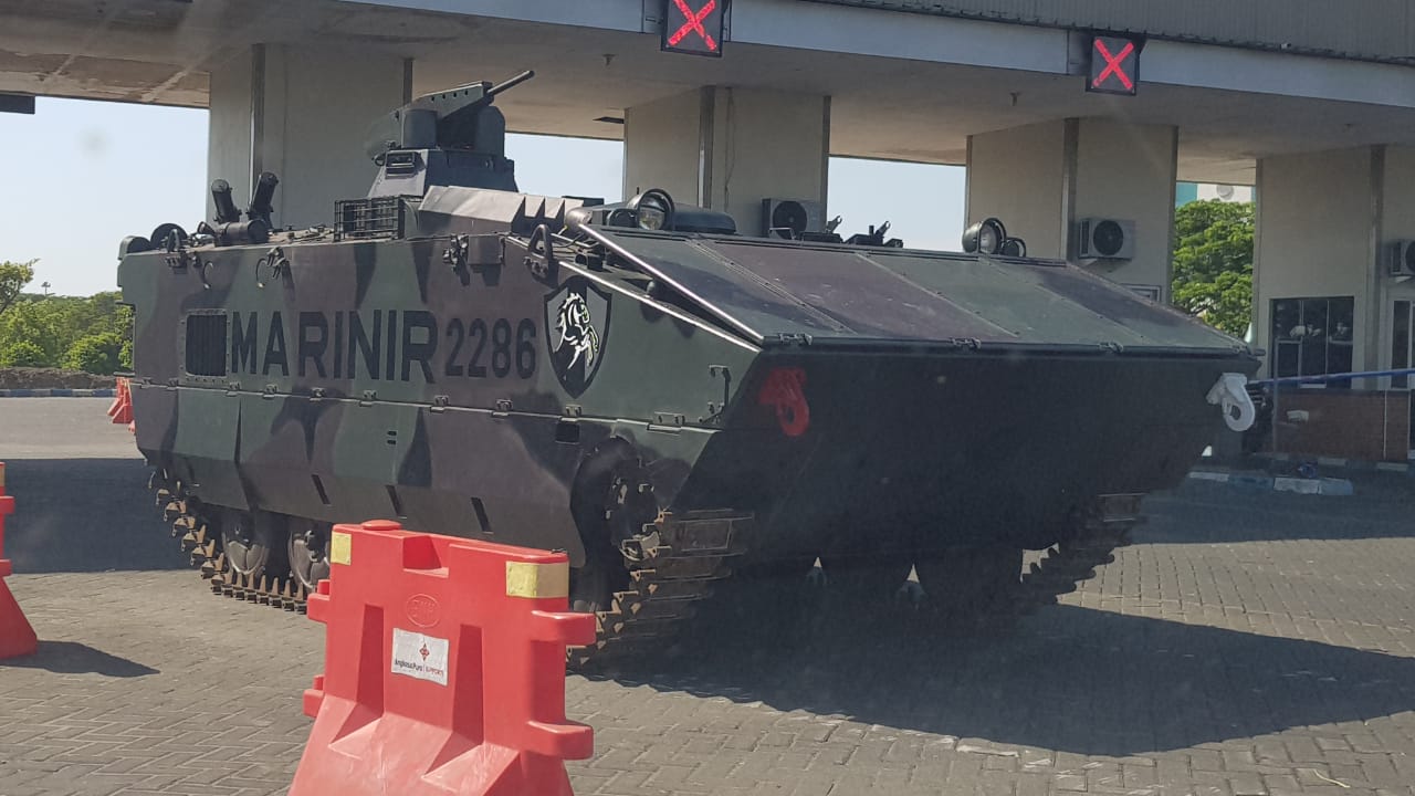 Tank amfibi yang di bagian lambung terdapat tulisan MARINIR 2286 itu disiagakan di tengah gerbang menghadap ke barat.