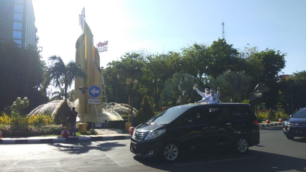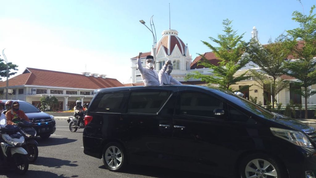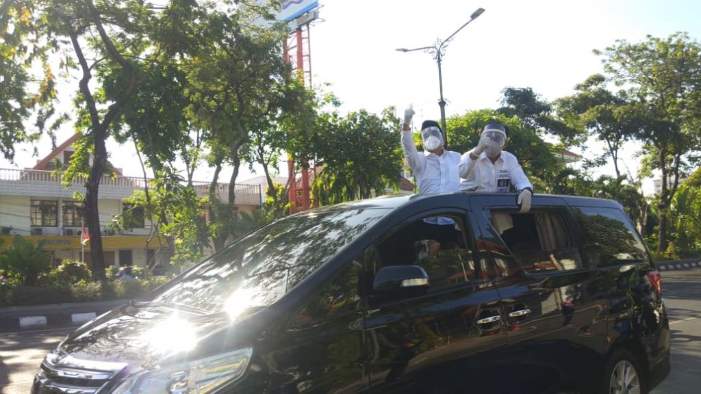 Menerapkan protokol kesehatan yang ketat, pendukung menyapa Machfud Arifin-Mujiaman yang melintas