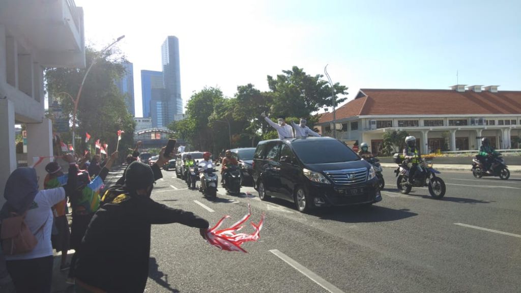 Di sepanjang jalan, dari posko pemenangan hingga ke KPU Kota Surabaya, para pendukung mengeluk-elukan pasangan Machfud Arifin-Mujiaman yang didukung 8 partai pengusung yaitu PKB, Gerindra, PKS, Golkar, Demokrat, NasDem, PAN dan PPP.