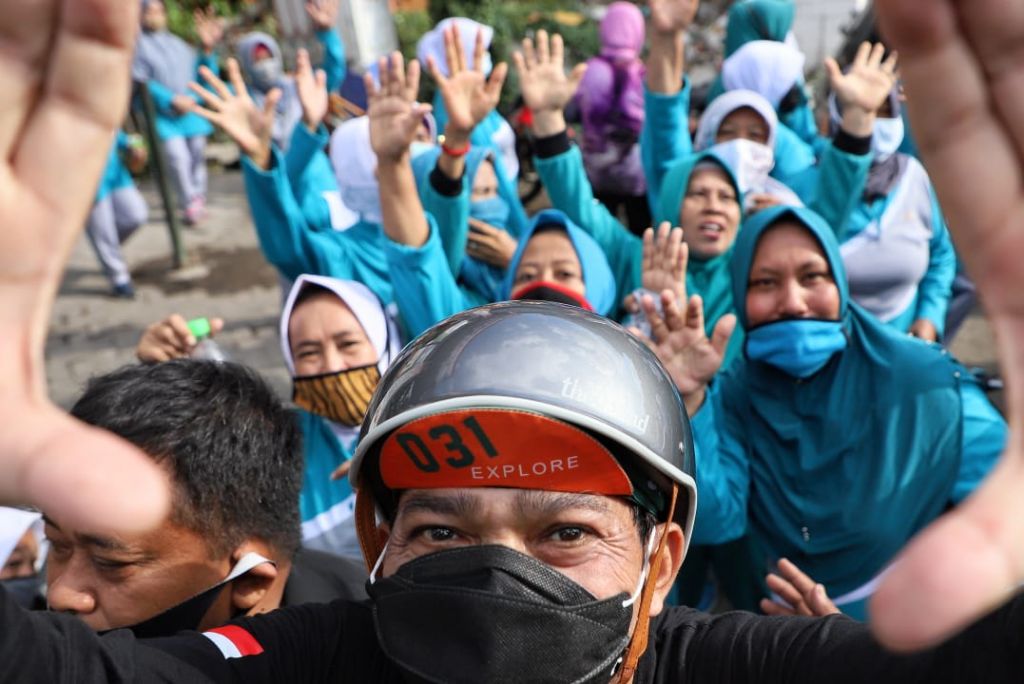 Saat di posko, dengan tetap menerapkan protokol kesehatan Covid-19, Machfud Arifin menyapa ibu-ibu dari relawan.