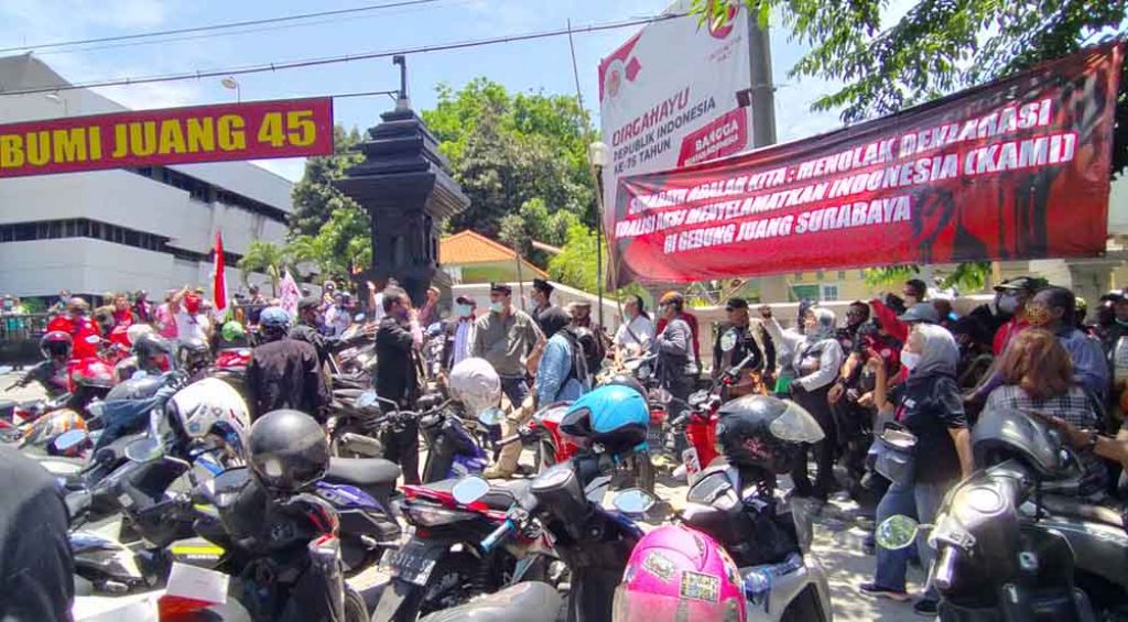 jatimnow.com - Massa yang mengatasnamakan 'Surabaya Adalah Kita' menggelar demo di depan Gedung Juang 45 yang berada di Jalan Mayjend Sungkono, Senin (28/9/2020).