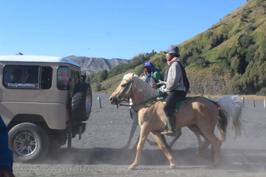 Wisatawan dapat menaiki kuda atau jeep di lautan pasir Gunung Brom