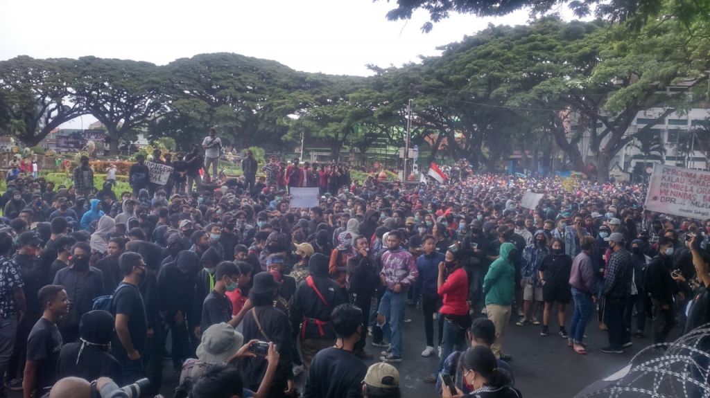 jatimnow.com - Aksi demo menolak UU Omnibus Law yang dilakukan ribuan mahasiswa se Malang Raya di depan DPRD Kota Malang dan Pemkot Malang berlangsung ricuh, Kamis (8/10/2020).