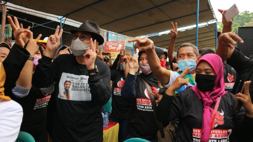Mat Mochtar mengajak banteng-banteng ketaton Surabaya mengacungkan salam dua jari, sebagai bentuk kesiapan memenangkan paslon nomor 2 Machfud Arifin-Mujiaman.