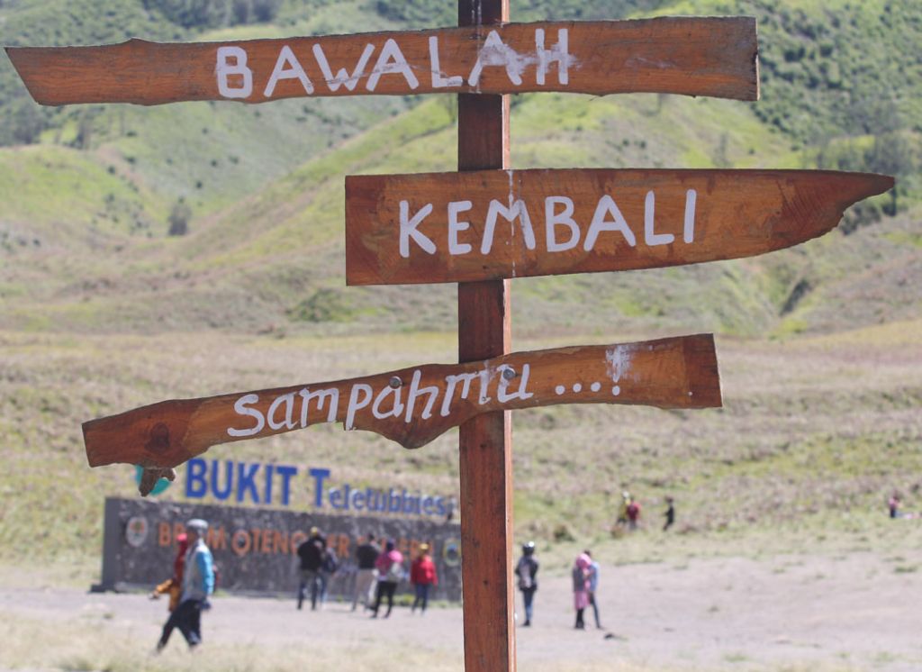 Jangan nyampah di Gunung Bromo. Pengelola Taman Nasional Bromo, Tengger, Semeru (TNBTS) memasang pengumuman agar wisatawan membawa pulang kembali sampahnya.