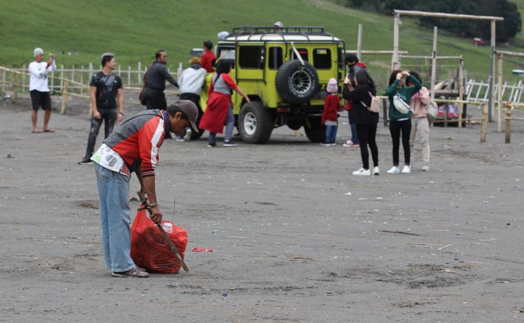 Peduli Lingkungan - Warga Suku Tengger ikut menjaga lingkungan di lokasi wisata Gunung Bromo. Mereka memunguti sampah yang ditinggalkan wisatawan yang berkunjung ke Bukit Teletubies