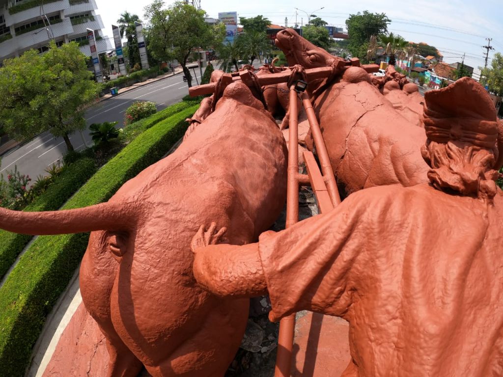 jatimnow.com - Di jantung Kota Surabaya terdapat patung Karapan Sapi. Ciri khas Madura itu diapit Jalan Panglima Sudirman dan Basuki Rahmat.