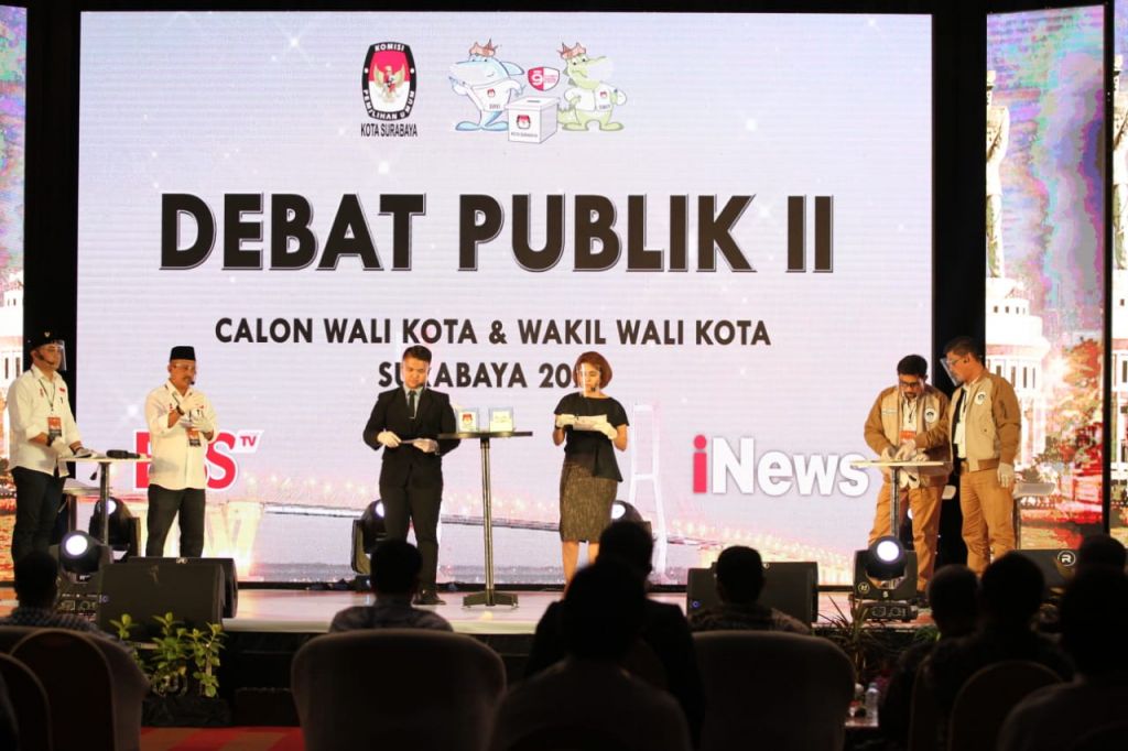 Debat publik kedua yang diselenggarakan di gedung Dyandra Convention Center, Jalan Basuki Rahmat, Surabaya, Rabu (18/11) mengusung tema 'Peningkatan pelayanan dan kesejahteraan masyarakat Kota Surabaya'.