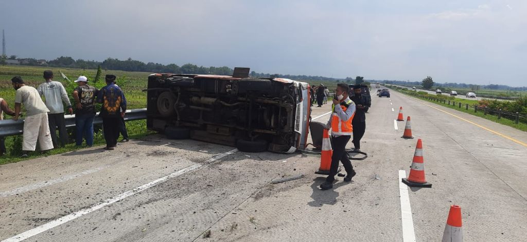 jatimnow.com - Minibus Elf bernopol N 7026 YJ mengalami kecelakaan tunggal di Jalan Tol Jombang-Mojokerto tepatnya di KM 676, Senin (23/11/2020).
