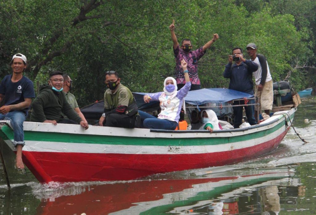 Saat mengunjungi Desa Kali Kajang, Sidoarjo, dua perahu motor yang ditumpangi rombongan Yuk Lia sapaan akrab istri dari calon Bupati Sidoarjo BHS nyaris gagal sandar karena air laut yang surut.