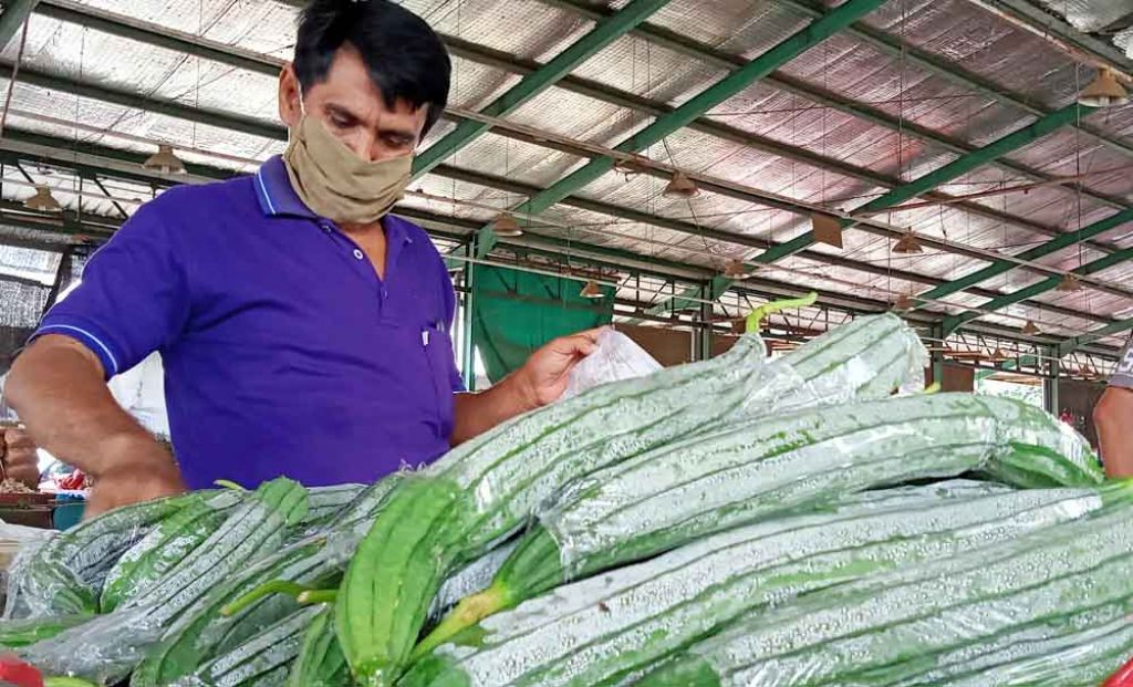 jatimnow.com - Para pedagang sayur di Pasar Induk Osowilangun Surabaya (PIOS) menerima pengiriman gambas segar atau oyong yang telah dibungkus plastik langsung dari petani Pare, Kediri.