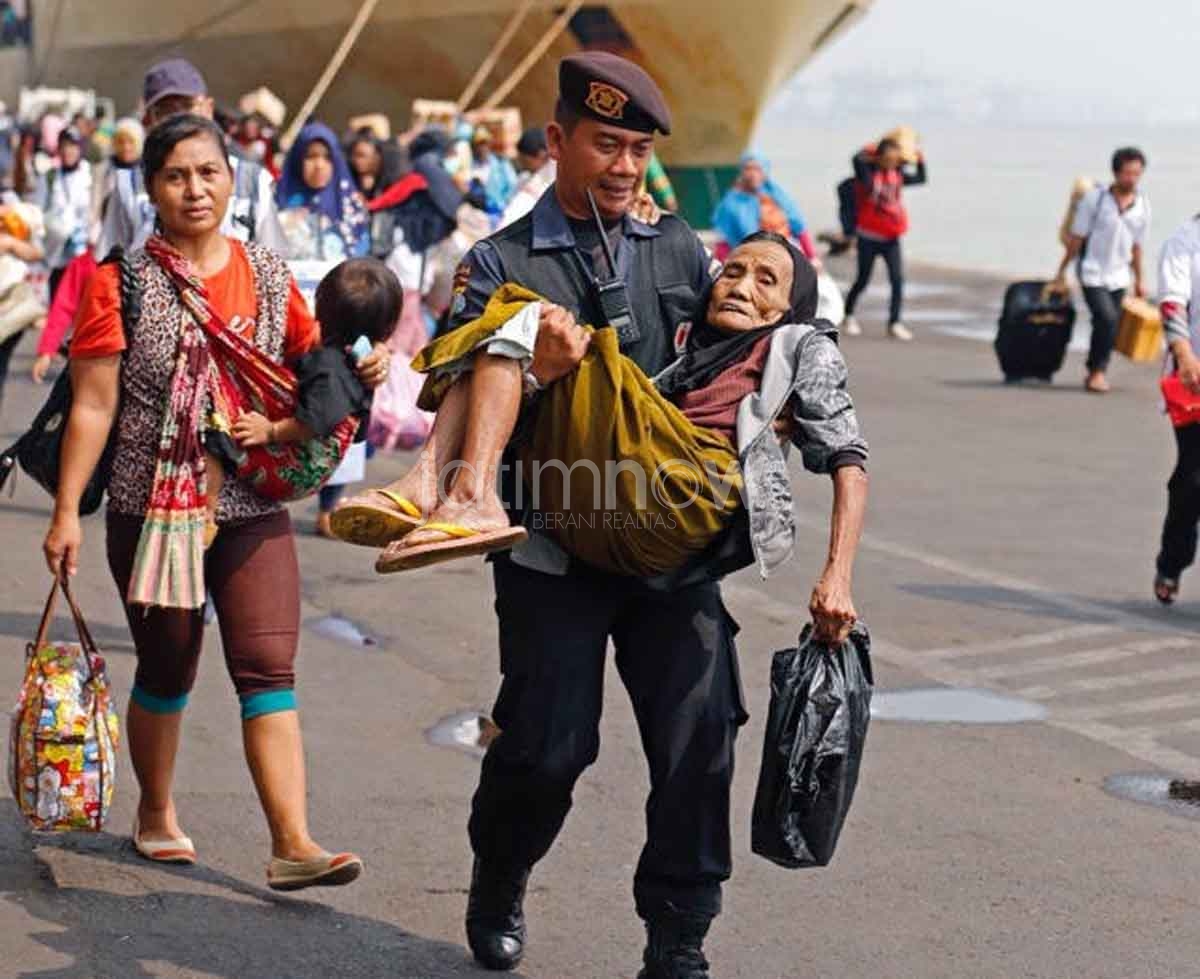 Petugas membantu salah satu pemudik lansia.