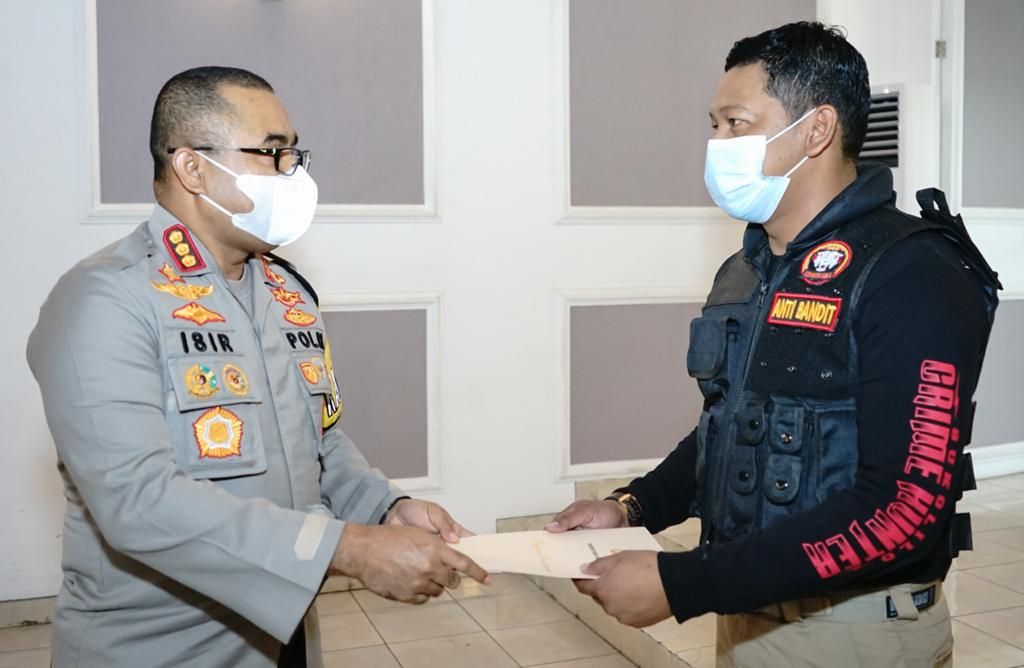 jatimnow.com - Tiga anggota Unit Reskrim Polsek Sukolilo menerima penghargaan atas kesigapan melakukan pengejaran dan menangkap dua bandit di bawah umur yang mencuri handphone milik satpam yang bertugas di ruko Mega Galaxy Surabaya.