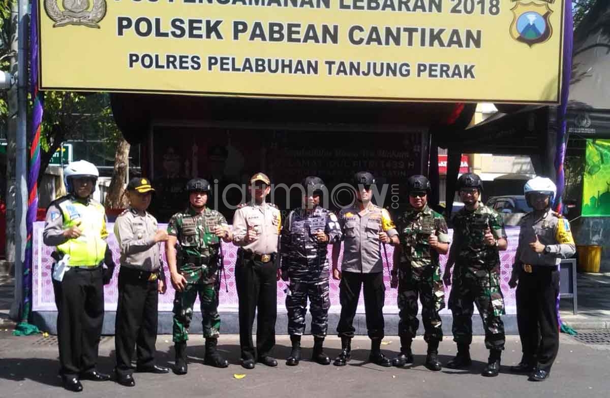 jatimnow.com - Sinergitas TNI-Polri sambut lebaran 2018, tersaji dari tepi laut utara Surabaya. Senin (11/06/2018), unsur TNI dan Polri melakukan patroli di wilayah hukum Polres Pelabuhan Tanjung Perak. Salah satunya mengecek pospam (pos pengamanan) lebaran di sejumlah titik.
