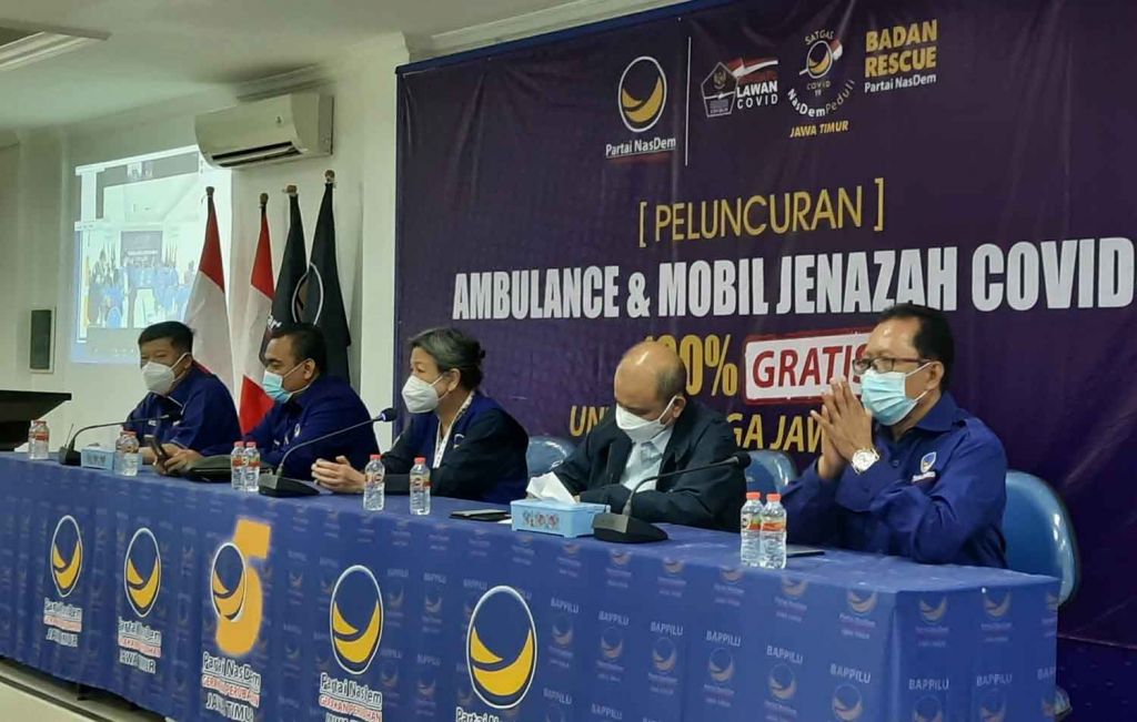 Ada lima mobil ambulans yang disediakan oleh Partai NasDem Jatim. Tiga mobil ambulans untuk pasien Covid-19 yang ditempatkan di Kabupaten Sidoarjo, Bangkalan dan Gresik. Sementara dua mobil jenazah disiagakan di Kota Surabaya.