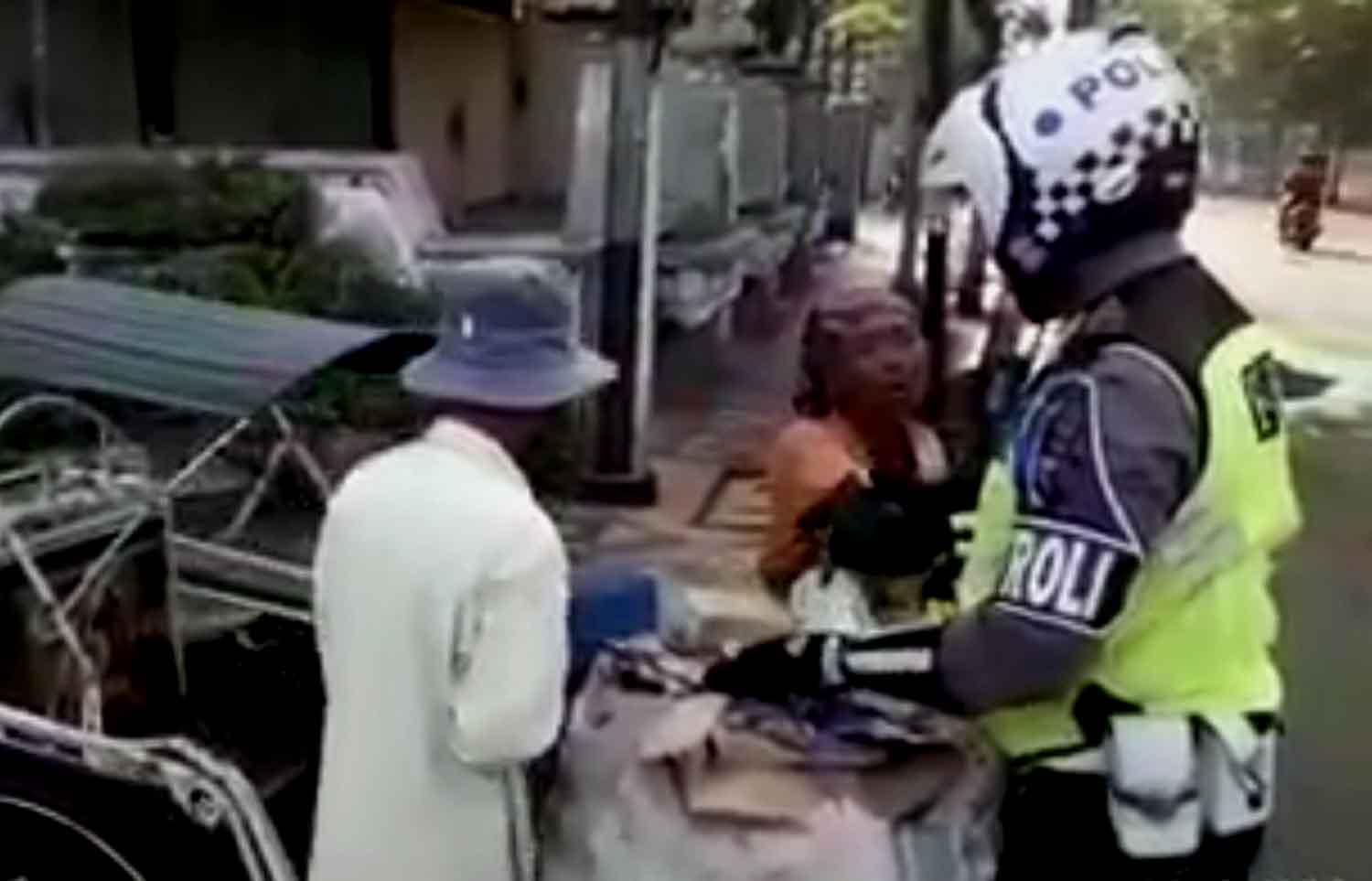 Dari video yang berdurasi 1 menit 39 detik itu, nampak seorang polisi lalu lintas yang mengusung barang rongsokan pemulung wanita, di atas helm polantas-nya.