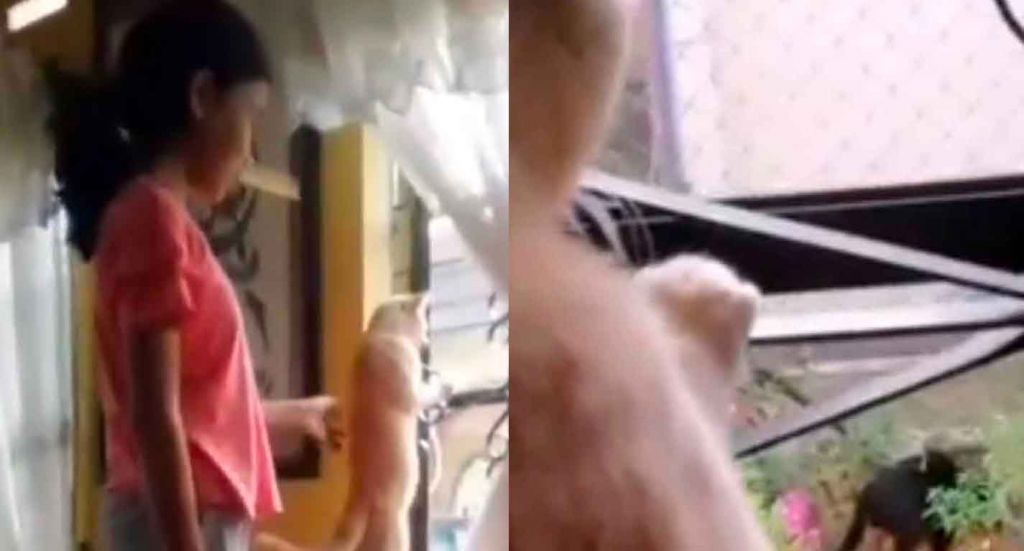 Sambil mengintip dari jendela kaca itu, punggung si kucing dielus-elus gadis perempuan atau pemilik kucing yang juga ditemani bocah perempuan di sampingnya.