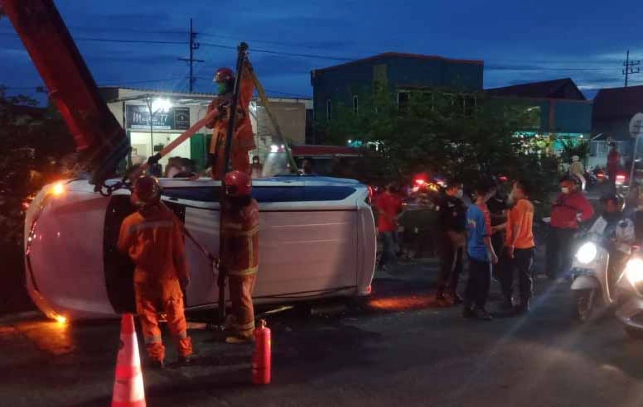 Surabaya - Mobil Toyota Avanza warna putih bernopol W 1617 SE terbalik di Jalan Raya Manukan Wetan, Kecamatan Tandes, Surabaya, Rabu (27/10/2021).