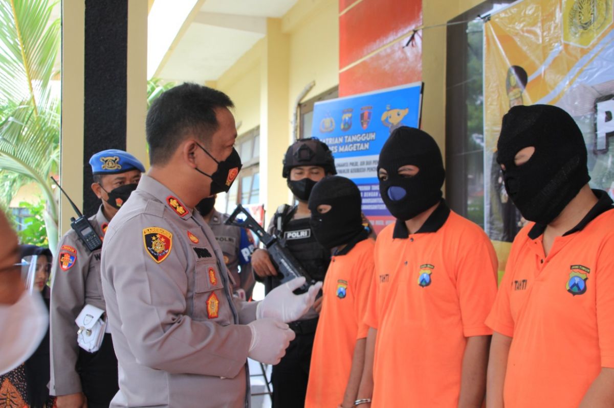 Kapolres Magetan AKBP Yakhob Silvana Delareskha menjelaskan, tiga tersangka adalah Ramadhan Wijaya, Andri Januardi, dan Muhammad Apis. Seluruhnya dibekuk di luar kota.