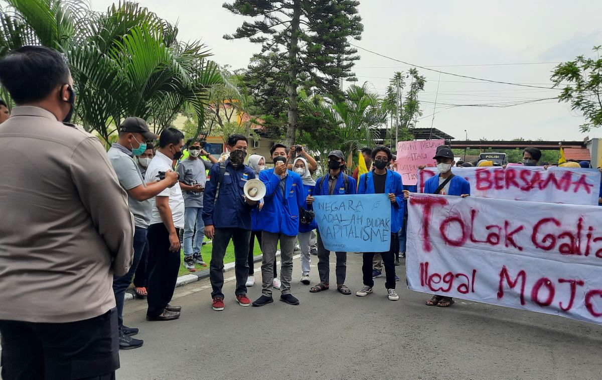 Mojokerto - Pengurus Cabang Pergerakan Mahasiswa Islam Indonesia (PMII) Mojokerto menggelar aksi damai di Polres Mojokerto karena banyaknya galian c ilegal.