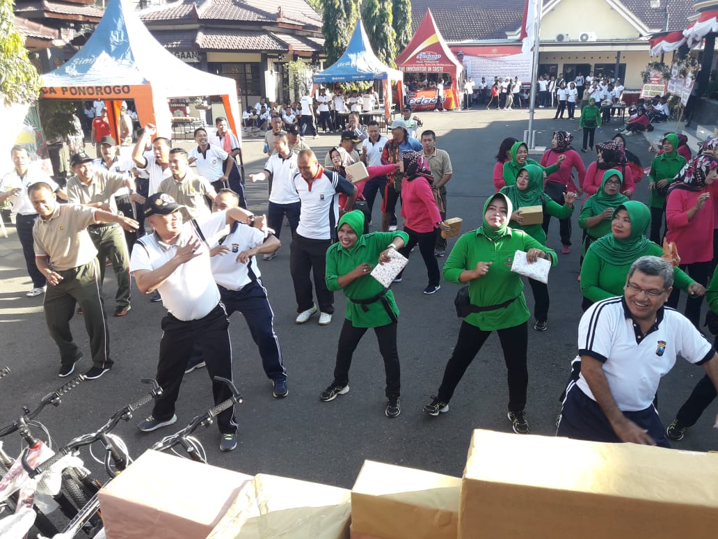jatimnow.com - Dalam rangka HUT Bhayangkara ke 72, Polres Ponorogo melakukan giat olahraga bersama dengan Kodim 0802 Ponorogo, Jumat (6/7/2018). Olahraga ini dikuti oleh anggota Polres Ponorogo dan Kodim Ponorogo. Kegiatan ini menyediakan ratusan hadiah.