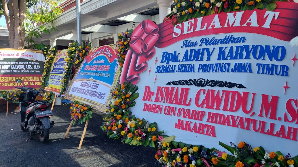 Surabaya - Karangan bunga ucapan selamat untuk Adhy Karyono sebagai Sekretaris Daerah (Sekda) Provinsi Jatim mulai memenuhi halaman Gedung Negara Grahadi, Jalan Gubernur Suryo, Surabaya, Jumat (15/7/2022).