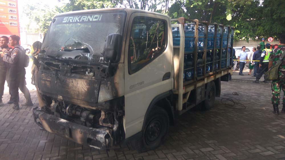 Satu truk lagi juga dilalap api. Truk muatan air mineral kemasan galon L 9757 NJ hangus di bagian depannya.