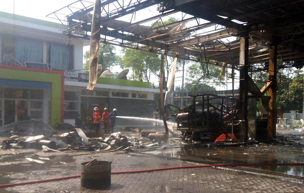 Tiga kendaraan dilalap api. Empat orang terluka yang dua diantaranya petugas operator BBM. Korban jiwa satu orang, yaitu kenek truk yang bermuatan tabung elpiji.