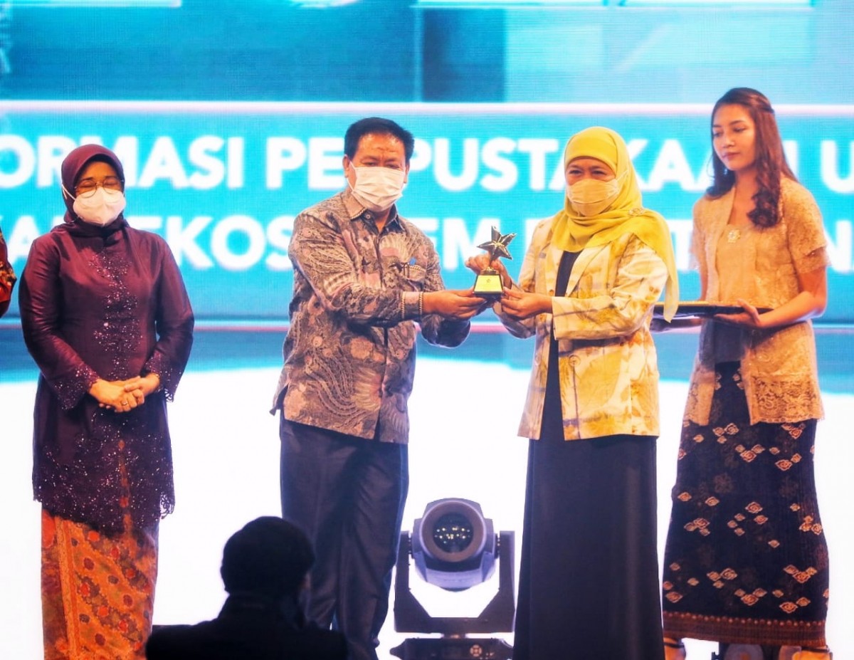 Penghargaan tersebut diterima Khofifah dari Kepala Perpusnas RI Muhammad Syarif Bando di acara Gemilang Perpustakaan Nasional Tahun 2022 di Integrity Convention Centre, Kemayoran, Jakarta Pusat, Senin (14/11/2022) malam.
