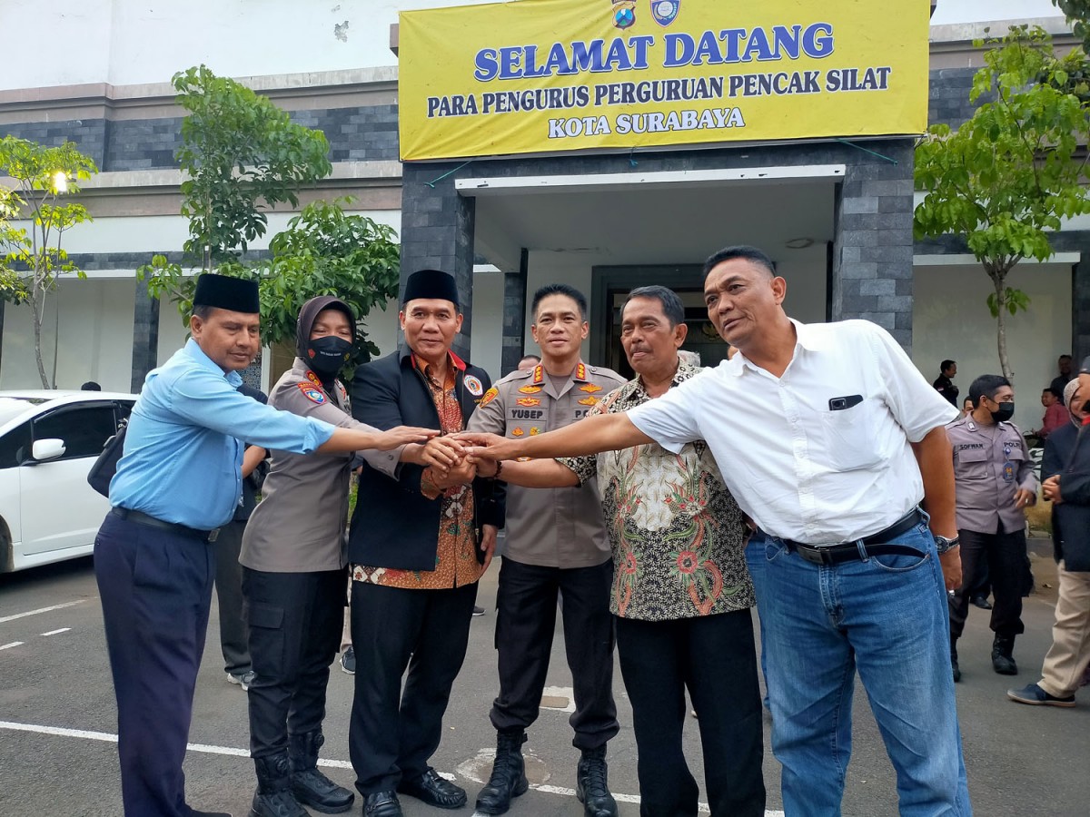 Kegiatan yang digelar dalam upaya menjaga kondusivitas dan meminimalisir gesekan antar perguruan silat di Surabaya ini digelar di Gedung Bharadaksa, Mapolrestabes Surabaya, Jumat (18/11/2022).