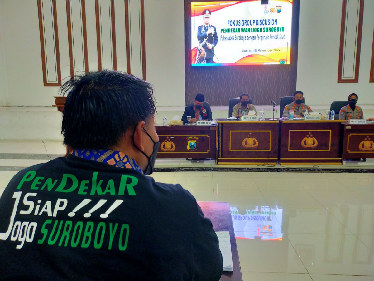 jatimnow.com - Polrestabes Surabaya menggandeng 35 pimpinan perguruan pencak silat di Kota Pahlawan untuk menggelar forum grup diskusi bertema 'Pendekar Wani Jogo Suroboyo'.