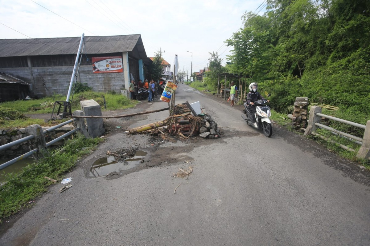 jatimnow.com - Jembatan penghubung dua desa di Kecamatan Buduran, Kabupaten Sidoarjo rusak. Karena dinilai membahayakan pengguna, warga memberi tanda bagian yang rusak dengan batu, sofa hingga pohon pisang.