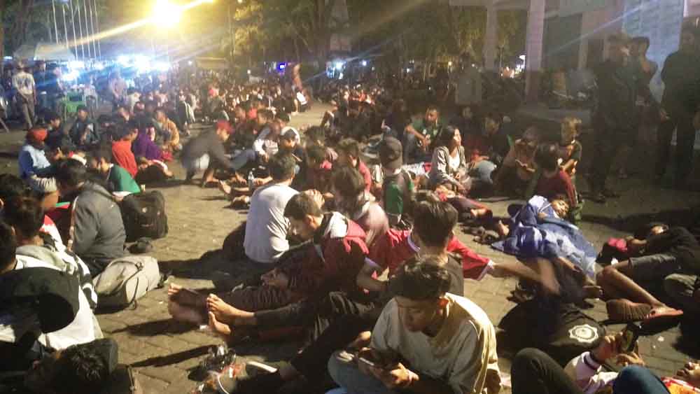 Para suporter nampak sudah berbaring tidur di atas tanah dan sesekali terdengar suara teriakan dari salah satu pendukung.