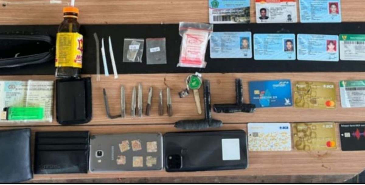 "Selain barang bukti narkoba, juga ditemukan 2 kunci leter T, 7 buah anak meta kunci leter T, 2 buah dompet, 2 unit handphone, 1 SIM, 2 Kartu BPJS dan 4 KTP dengan nama yang berbeda-beda," ungkapnya.
