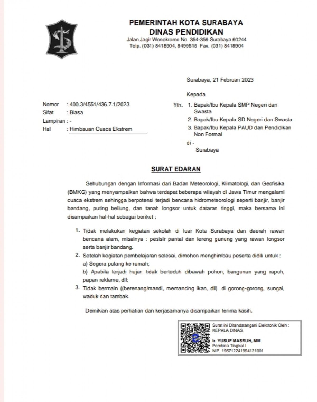 Kepala Dinas Pendidikan Surabaya, Yusuf Masruh mengatakan pihaknya langsung mengeluarkan Surat Edaran (SE) nomor 400.3/4551/436.7.1/2023 terkait himbaun cuaca ekstrem tanggal 21 Februari 2023.