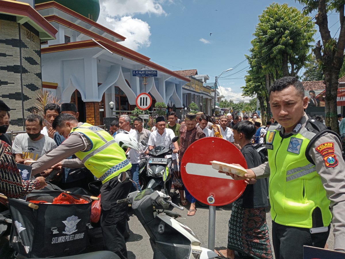 jatimnow.com - Anggota Polres Jombang menyebar ke beberapa masjid untuk mengatur lalu lintas dan membagikan nasi kotak pada jamaah usai Salat Jumat.