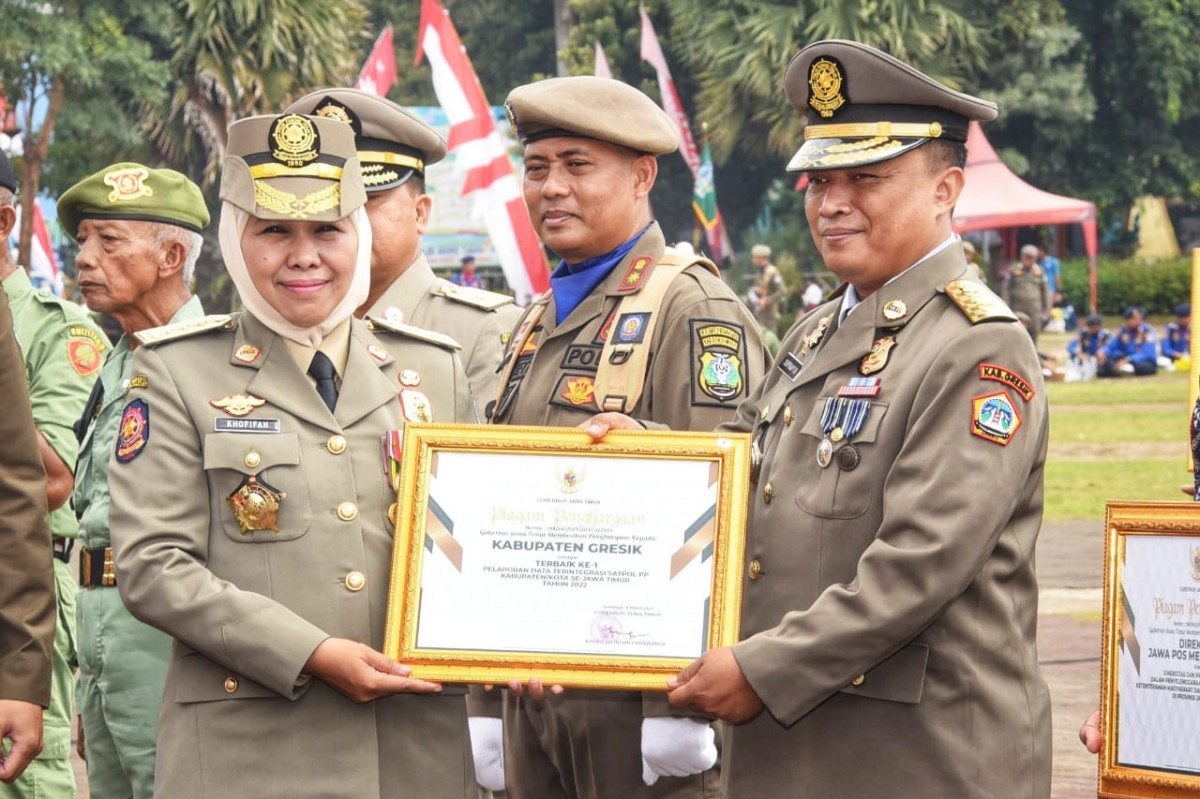 Hal tersebut disampaikan Khofifah dalam upacara Gelar Pasukan peringatan HUT ke-73 Satuan Polisi Pamong Praja (Satpol PP), HUT ke-61 Satuan Perlindungan Masyarakat (Satlinmas) dan HUT ke-104 Pemadam Kebakaran dan Penyelamatan Tahun 2023 di Alun-alun Kabupaten Tuban, Rabu (8/3/2023).