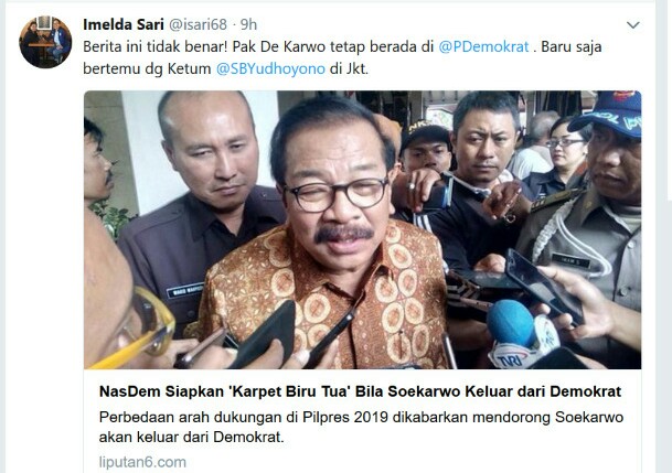 "Berita ini tidak benar! Pak De Karwo tetap berada di @PDemokrat. Baru saja bertemu dg Ketum @SBYudhoyono di Jkt", tulis dia saat mengomentari salah satu judul media online "NasDem siapkan 'karpet biru tua' bila Soekarwo keluar dari Demokrat".
