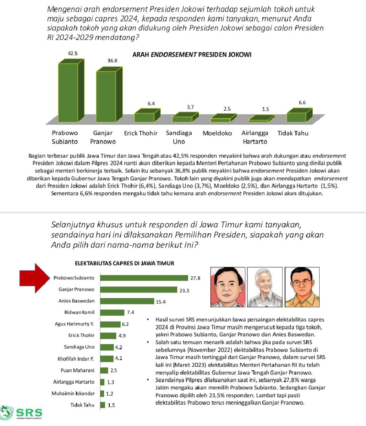 SRS bahkan memberi pertanyaan kepada responden yang ada di Jawa Timur dan juga Jawa Tengah terkait arah endorsement Presiden Jokowi kepada salah satu tokoh di Pilpres 2024.