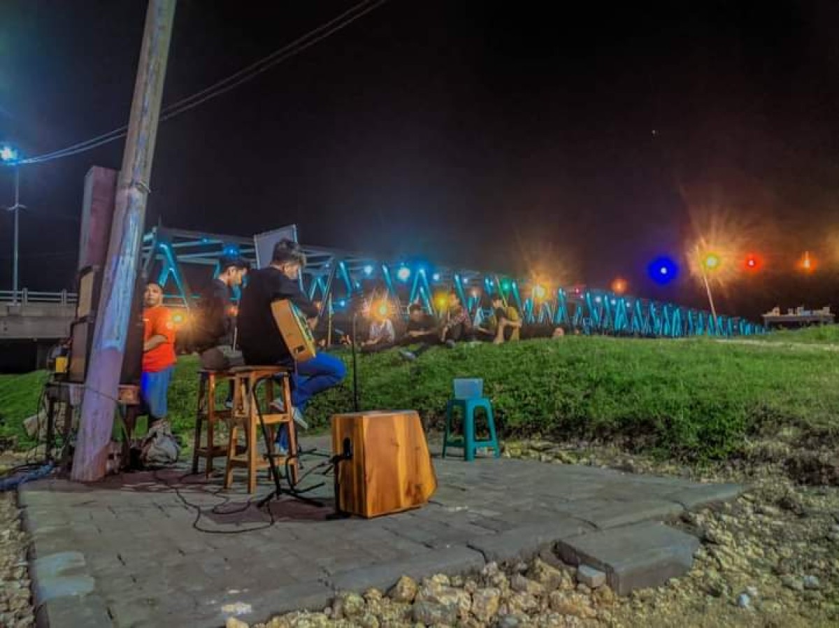 Panorama landscape Sungai Bengawan Solo ditambah gemerlap lampu hias jembatan yang membuatnya terlihat estetik cocok untuk berswafoto.