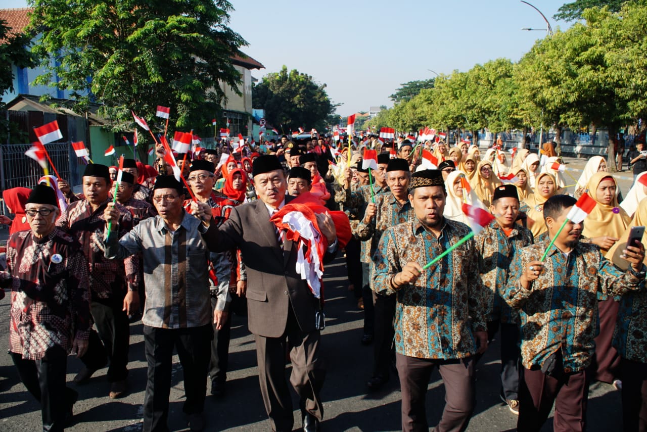 jatimnow.com - 500 peserta di Masjid Al Akbar melaksanakan kirab bendera merah putih akbar berukuran 17 X 25 Meter.