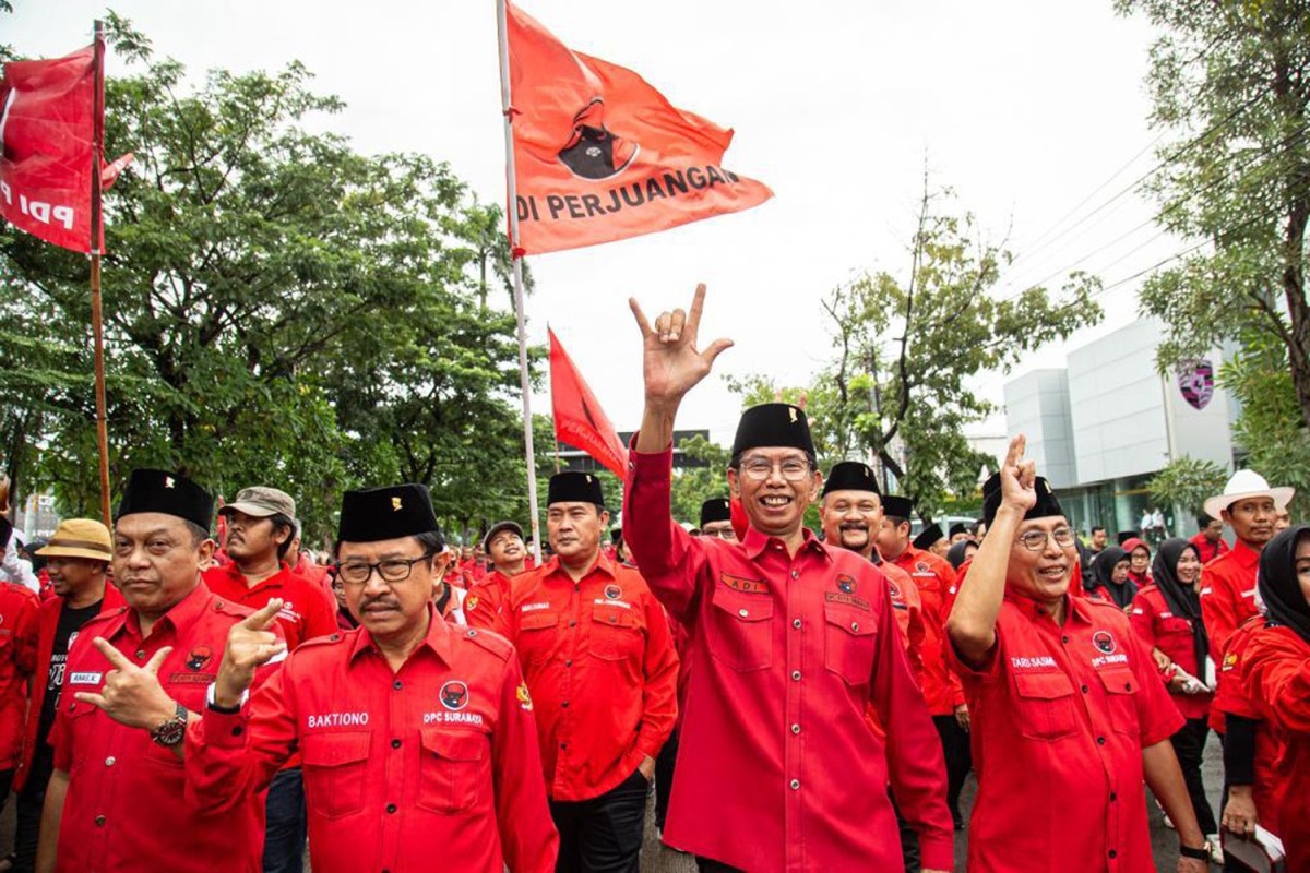 Ribuan orang ikut mengiringi, mulai dari para pengurus PDIP di Surabaya, level kecamatan, kelurahan, sampai akar rumput. Juga rombongan anak-anak muda, kaum milenial. Long march dipimpin langsung oleh Ketua DPC PDI Perjuangan Kota Surabaya, Adi Sutarwijono dan Sekretaris DPC Baktiono.