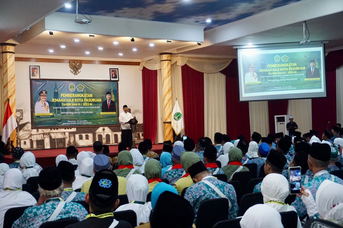 jatimnow.com - Wali Kota Pasuruan Saifullah Yusuf (Gus Ipul) berangkatkan kloter 66 calon jemaah haji (CJH) di depan Gedung Gradhika Kota Pasuruan, Jumat (16/6/2023).