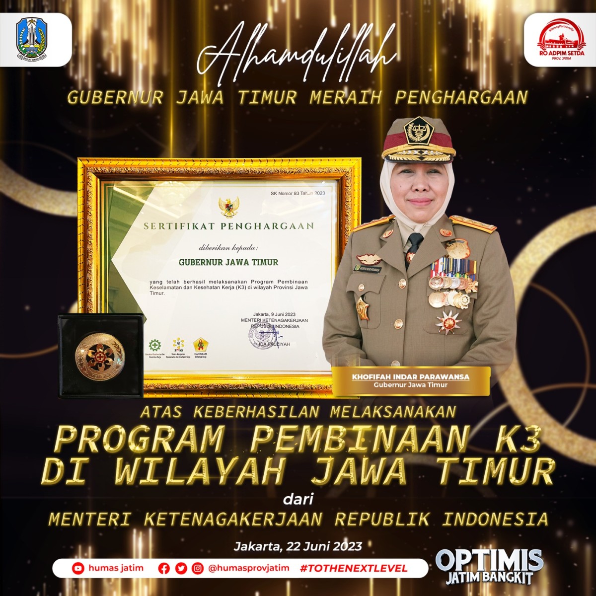 “Alhamdulillah ini ke lima kalinya kami mendapatkan penghargaan sebagai Pembina K3. Terima kasih atas seluruh sinergi berbagai pihak yang tetap menjadikan K3 sebagai prioritas bersama,” ungkap Khofifah, Jum'at (23/6/2023).