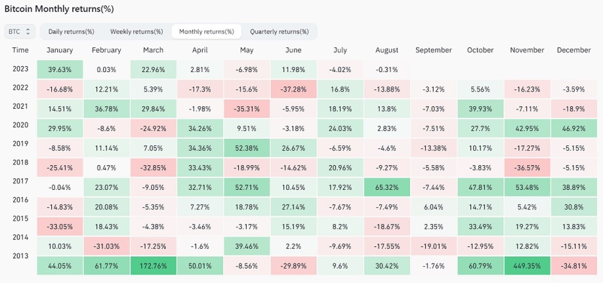 Menurut indeks Bitcoin Monthly Returns, pergerakan harga Bitcoin pada bulan Juli lalu berakhir dengan minus, karena tidak dapat mempertahankan harga di atas US$ 30.400 hingga tanggal 31 Juli 2023.