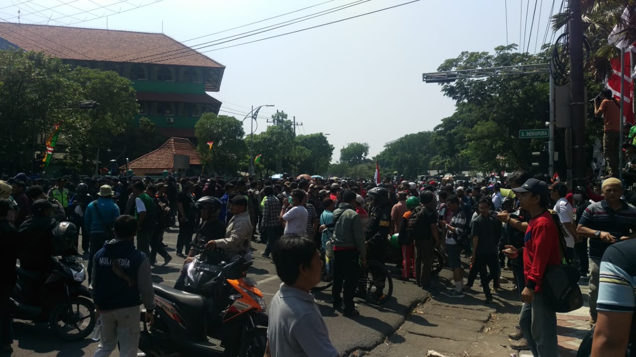 jatimnow.com - Meski aksinya sempat dibubarkan di Jalan Tembaan, massa aksi #2019GantiPresiden di Surabaya kembali berkumpul dengan jumlah lebih besar, di Jalan Indrapura, depan Gedung DPRD Jatim.