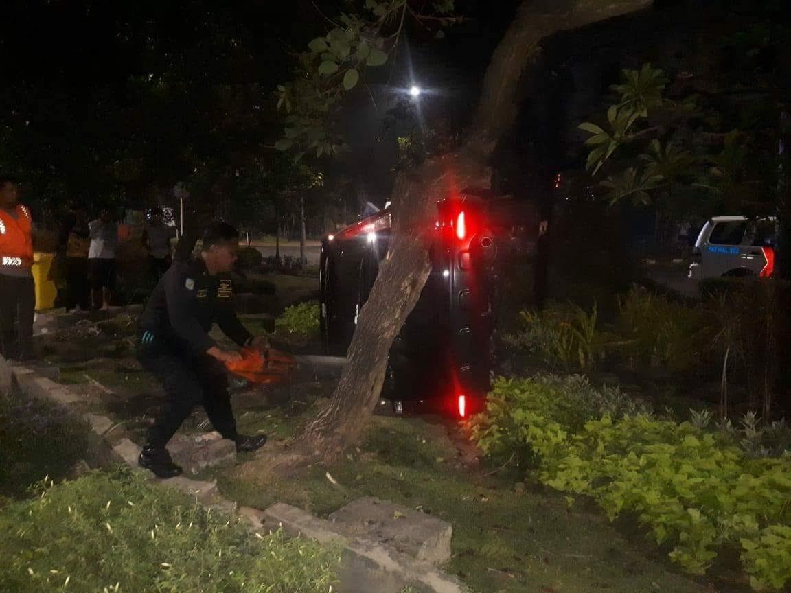 jatimnow.com - Meski arus lalu lintas di Jalan Jemursari Surabaya dalam keadaan lengang. Namun, sebuah mobil Honda CRV tiba-tiba nyungsep ke atas taman dan menabrak pohon hingga terbalik. Mobil itu, diketahui dikemudikan seorang perempuan.