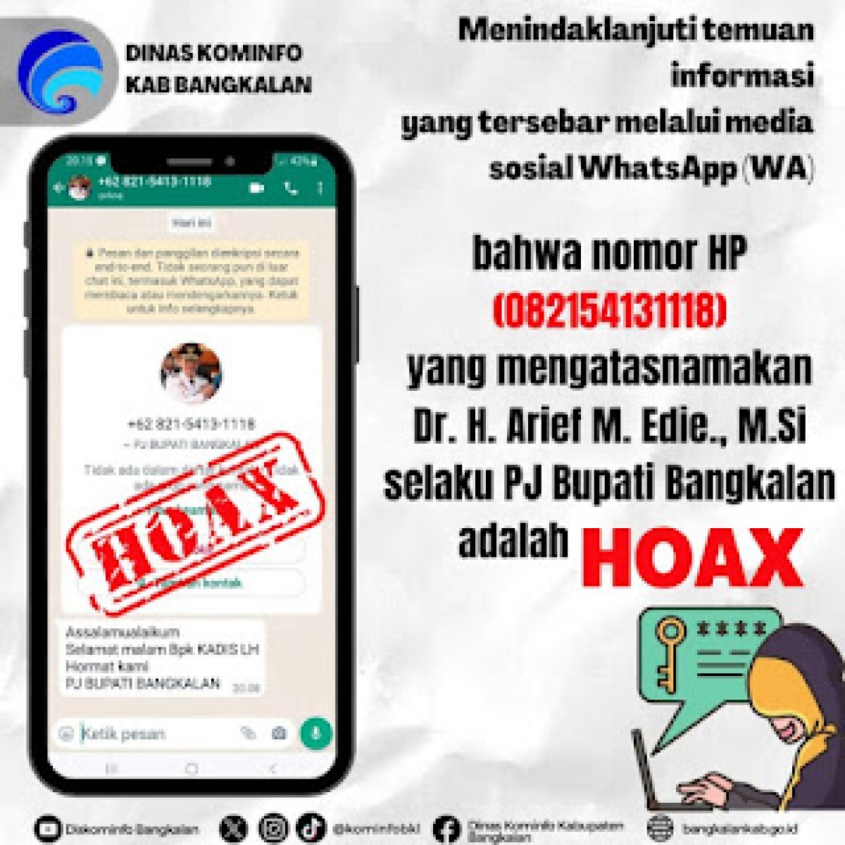 Sementara itu, Pj Bupati Bangkalan, Arief M Edie menegaskan nomor tersebut bukanlah miliknya. Ia juga meminta agar masyarakat melaporkan ke Pemkab Bangkalan jika terdapat kerugian yang disebabkan oleh akun palsu tersebut.