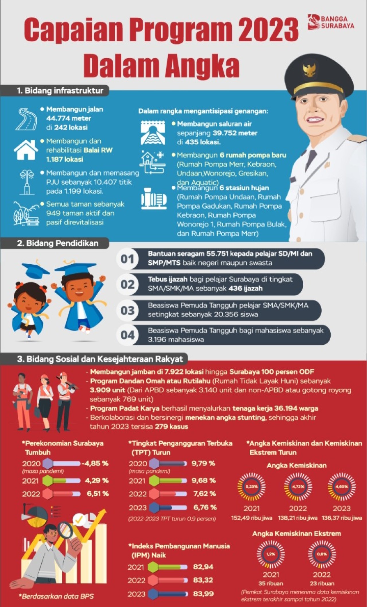Pasalnya, sepanjang tahun 2023, ada seabrek capaian program Wali Kota Eri bersama jajaran Pemerintah Kota (Pemkot) Surabaya yang langsung dapat dirasakan oleh warga.